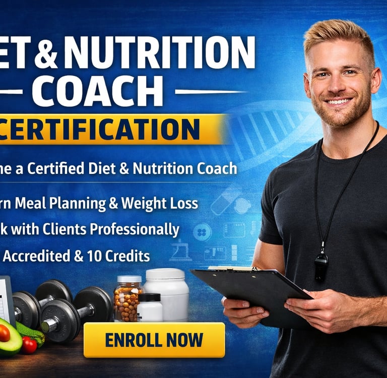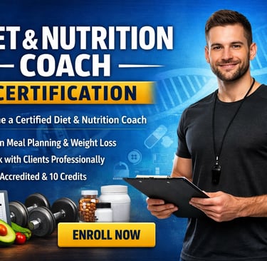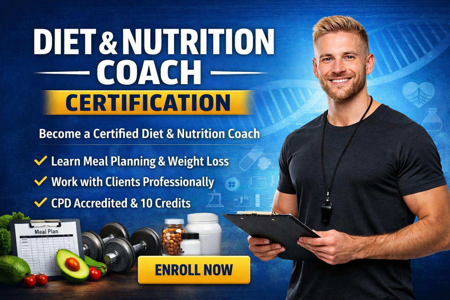 The Diet and Nutrition Coach Certification is a CPD-accredited course designed for anyone who wants to coach others on dieting, weight loss, muscle building, and healthy eating — whether online or in person.