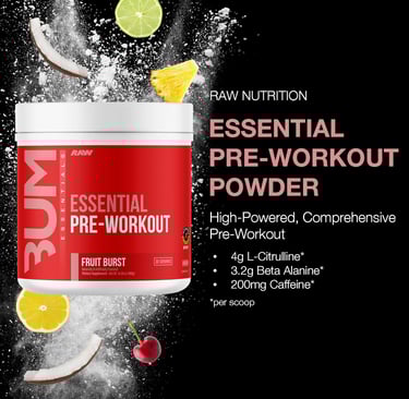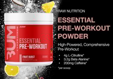 RAW Essential Pre-Workout Powder (Fruit Burst) is a pre-workout formula by Chris Bumstead Sports Nutrition, designed for both men and women seeking clean energy, mental focus, and improved workout performance without unnecessary stimulants.