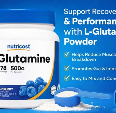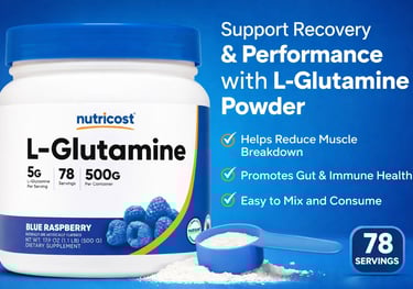 Nutricost L-Glutamine Powder (Blue Raspberry) is a powdered L-glutamine supplement designed to support muscle recovery, gut health, and overall training performance. Its clean formula mixes easily, making it a practical choice for men and women who train consistently.